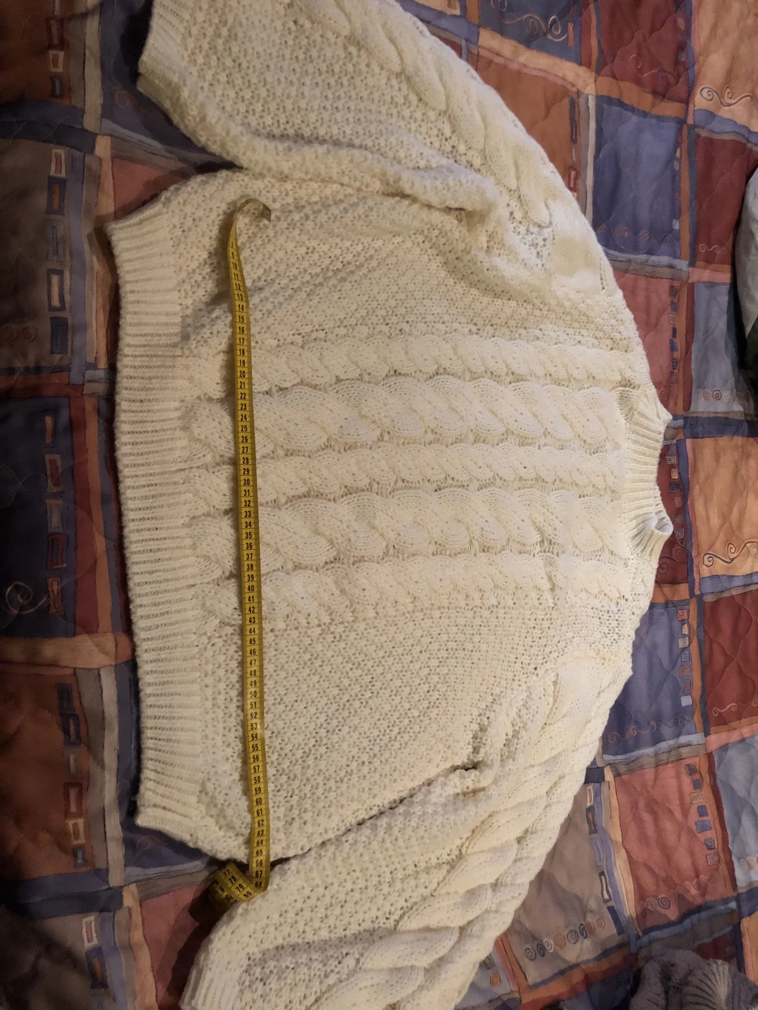 Wonderful sweater. The color is milky. Very beautiful. Not like in the photo, but I liked it. I am satisfied. The sweater is soft, gentle, warm. Large knit (need to tuck in a t-shirt).